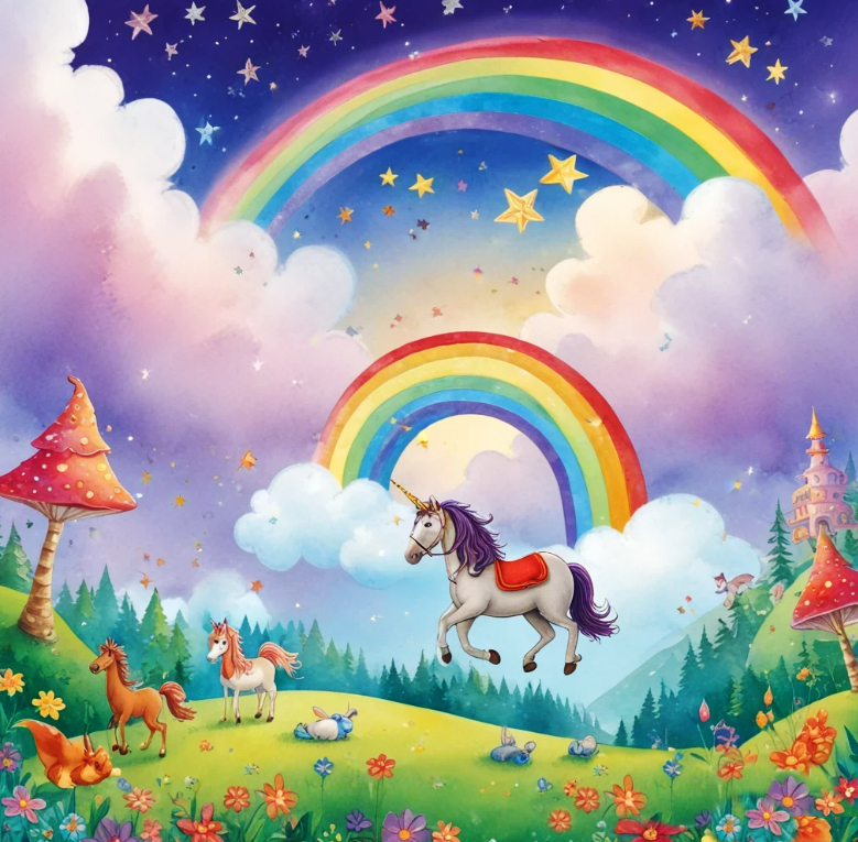 Eines Nachts, als der Mond hell am Himmel stand und die Sterne wie funkelnde Diamanten glitzerten, träumte Tim von einem ganz besonderen Abenteuer. In seinem Traum befand er sich auf dem Rücken eines majestätischen, fliegenden Einhorns. Das Einhorn hatte ein schneeweißes Fell, das im Mondlicht glänzte, und eine Mähne, die in allen Farben des Regenbogens schimmerte. Freudig jauchzend ritt Tim durch die Lüfte, während das Einhorn über weiche Wolken flog und sie mit seinen Hufen sanft berührte. Dabei ließ es glitzernde Staubkörner regnen, die wie kleine Sterne in der Luft schwebten.